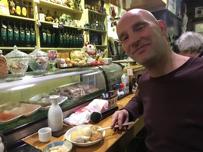 … 1 day (and many cups of Sake) later, in an old neighborhood of Sapporo with Mayu and Kazoo (a musician, used to live in the U.S.A. and even played together with John Lee Hooker Jr.) … 🙂