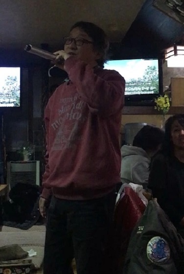 … if you want to know about Japanese life, don’t go to a professional Karaoke store, come to a place like this one, its called „Izakaya“ and some of them having Karaoke equipment; people from the neighborhood gather at the counter, talk about everything, enjoy cheap meal home made, most bottles on the shelf have personal name plates (so people can enjoy their own bottle of spirit for a while), who ever likes to sing can start singing, if Karaoke equipment is available or not, no special entertainment, usually no TV-show running, no advertisement, just life 😉