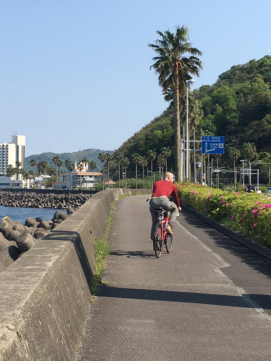 In Japan sind die Leute sehr mobil, viele nutzen ein Auto (sehr viele Hybride und PS-starke SUV von Wohlhabenden, aber auch Kleinwagen aus Platz- und Steuergründen), doch noch mehr den hervorragend ausgebauten und üblicherweise reibungslos funktionierenden Nahverkehr mit Zügen, denn die ausschließlich für den Autoverkehr zugelassenen Highways sind nicht nur teuer – hier in Japan funktioniert im Gegensatz zu Deutschland das Mautsystem anstands- und unterschiedslos – sondern auch zu den Stoßzeiten am Morgen und abends, wenn viele Transporter und Pendler unterwegs sind und besonders an den freien Tagen zu Sakura, Golden und Silver Week, vom Stau bedroht. Das Fahrrad in den o.e. Zügen mitzunehmen ist nur möglich, wenn es auseinandergenommen in einer entsprechend großen Tasche verstaut ist und der Zug nicht so voll ist, dass man andere Leute mit solch sperrigem Gepäck behelligt. Zwar finden sich in größeren Orten auch Leihräder, doch für längere Strecken sind diese, auch aufgrund ihrer standardisiert klobigen Bauweise, wenig geeignet. Es ist also auf Honshu eher so, dass die Radler (wie auch die Surfer) mit dem Auto dahin fahren, wo sie weiterer Lust frönen können. Zahlreiche Gasthäuser mit allen möglichen Ablenkungen und Leckereien in schöner Vielfalt – die Japaner haben eine unvergleichlich facettenreiche Welt an kulinarischem und anderem Genuss entwickelt – bieten ausreichend Stellplätze und spezielle Rahmen zum Einhängen der Räder und es gibt sogar in den Ortschaften große Parkhäuser für Fahrräder nicht weit weg von den Bahnstationen. In den Städten sollten die Fahrräder übrigens nicht wahllos irgendwo abgestellt werden, denn freie Plätze sind so rar wie teuer und wie für die Automobile (wer in Japan ein Auto anmeldet, muss gewöhnlich auch einen Parkplatz dafür ausweisen können!) gibt es auch für Fahrräder extra Park- und Abstellplätze.