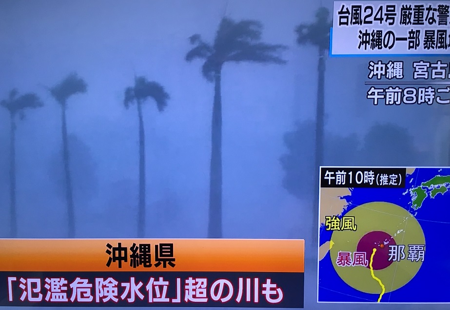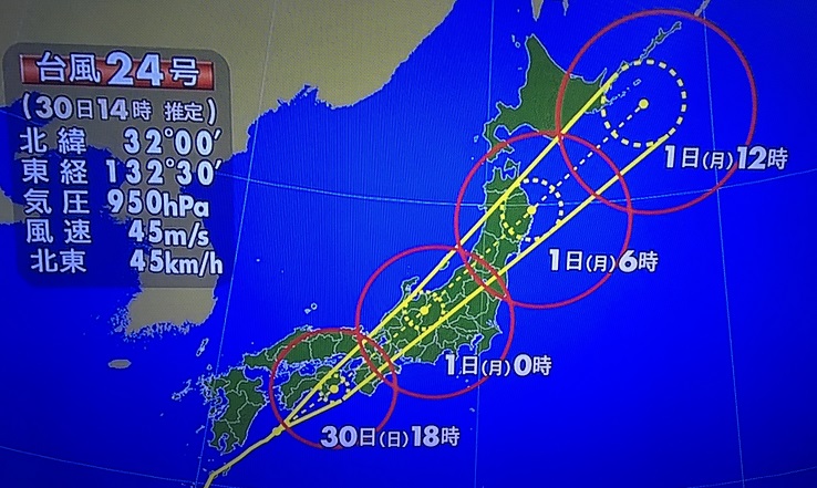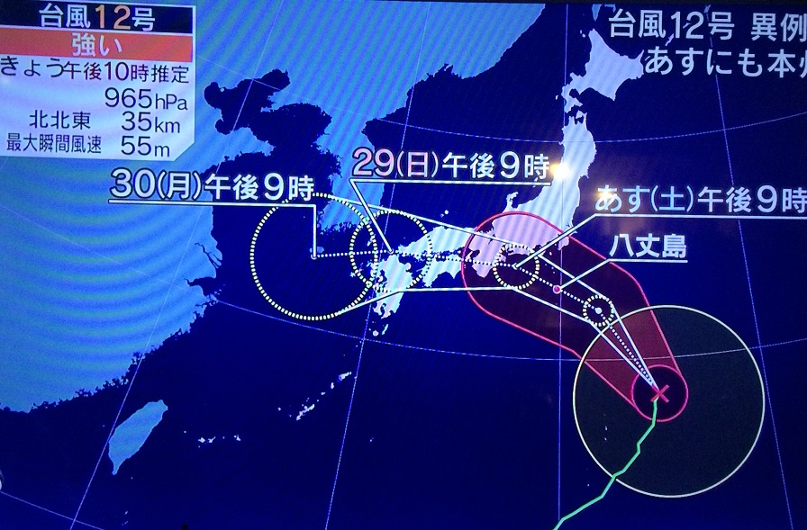 Glücklicherweise ist unser Haus hier in der Shonan-Area, Präfektur Kanagawa, recht neu und stabil gebaut. Aber die Kraft von Wind und Wasser (Taifun führt nicht nur starken Strumwind mit sich, sondern schiebt auch jede Menge Wasser/Regen und tropische Hitze vor sich her) dringt durch jede einzelne Lücke. Es wird ziemlich heiß, so um die 30̊C; man sollte alles reinbringen (Fahrräder etc.) und auf die Robustheit der Infrastruktur hoffen (Bloß kein Elektrizitätsausfall!). Während der letzten Nacht wurden die Stürme enorm heftig und schüttelten das Haus durch wie ein Erdbeben der Stärke 2. Die automatischen Warnanrufe, sich in Schutzunterkünfte zu begeben, gingen an jedes Telefon.