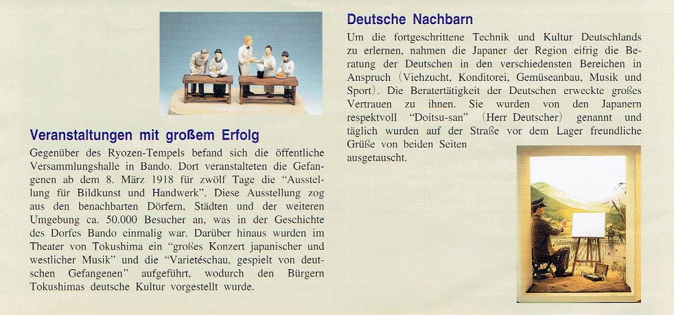 Deutsche Garnisonstruppen waren bis November 1914 in Tsingtao (Qingdao) stationiert, einem Kolonialstützpunkt und Hafen an Chinas Ostküste gegenüber Südkorea. Bis heute erfreut sich zumindest die dort gegründete deutsche Brauerei großer Beliebtheit in Asien – und nicht nur dort, denn Tsingtao-Bier wird global vermarktet. Nach Beginn des Krieges (Erster Weltkrieg) in Europa baten die Engländer Japan um Waffenhilfe in Asien; japanische Militärführer und Politiker, die selbst auch Eroberungspläne auf dem asiatischen Kontinent hatten, taten ihnen und sich diesen Gefallen und entsandten Kriegsschiffe mit ihren Truppen dorthin. Ende August 1914 begannen die Kampfhandlungen rund um den Hafen Tsingtao, am siebenten November war alles vorbei, die Besatzer ergaben sich und wurden auf verschiedene Lager verteilt, deren eines im damaligen Bando errichtet wurde. Aus diesem entwickelte sich sozusagen ein mustergültiges Kriegsgefangenenlager, das nicht nur geduldet, sondern sogar gefördert wurde von lokalen japanischen Verantwortlichen, mit Kultur- und Sportanlagen, auch in Interaktion mit umliegenden Gemeinden und japanischen Behörden (im Museumsprospekt werden gar blauäugige Nachkommen der Bandoer erwähnt, was ich als Deutscher in JP nachvollziehen kann – wir sind hier quasi Exoten und die anziehende Faszination japanischer Frauen ist nach meinem Dafürhalten unwiderstehlich). Preußische Staatsbeamte hatten zur Unterstützung der Meiji-Reform in Japan gegen Ende des 19. Jahrhunderts mitgeholfen bei der Ausarbeitung einer modernen Verfassung. Positive Erinnerungen an diese Zeit waren offenbar in Japan noch vorhanden und halfen dabei, militärische Feindseligkeiten wieder vergessen zu machen.