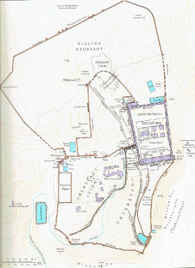 Die nach der Abtrennung des Nordreiches Israel in Jerusalem residierenden Könige des Südreiches Juda werden wie die des Nordreiches in den Bewertungen der Bibel nach ihrer Gottgefälligkeit gemessen. Interessanterweise schneidet dabei gerade der mit über 50 Dienstjahren am längsten herrschende König Manasse sehr schlecht ab und erscheint als ein übler, schlecht an Gott und den Menschen handelnder Despot. Im 8. Jahrhundert passieren drei Ereignisse, die den Leuten von Jerusalem die Idee eines einzigartigen Schutzes der Stadt eingegeben haben. Ein Erdbeben um 760 v.Chr., das so stark war, dass es auch bei zwei biblischen Propheten (Amos, Sacharja) erwähnt wird, die Zerstörung des Nordreiches durch die assyrischen Könige Salmanassar V. und Sargon II. ab 733 v.Chr. und die Invasion des Sanherib von Assyrien um 721 v.Chr., der durch Juda zog. Jedes Mal wurde Jerusalem verschont, so als ob Gott seine Hand schützend über die Stadt hält. In dieser Zeit begann Jerusalem mehr und mehr im Zentrum der Prophetie zu stehen, nicht zuletzt dank der Flüchtlinge aus dem zerstörten Nordreich, und es entstand eine Ideologie, die auf ein Volk, eine Dynastie und eine Stadt fokussierte, auch wenn der Jerusalemer Tempel zu dieser Zeit nicht der einzige Gottestempel im Lande war. In dieser Zeit erstreckte sich Jerusalem schon nicht mehr nur auf die Stadt Davids und den Tempelberg. König Hiskia startete eine Reihe von zusätzlichen Befestigungsarbeiten und ließ das Wasser des Gihon durch den schon erwähnten Tunnel in die Befestigungen umleiten. Anfang des 6. Jh.v.Chr. war es mit Gottes Schirm allerdings vorbei. Die judäischen Könige hatten sich, hin und her gerissen zwischen den Großmächten Ägypten und Babylonien, einmal zu viel für die falsche Seite entschieden. Erst verschleppten die Babylonier die „Oberen Zehntausend“ wie es in der Bibel heißt (Aristokratie, Militär, Fachleute und Beamte) und trotz intensiver Mahnungen dem König gegenüber, trotz Wehklagen und Visionen der Propheten Jeremia und Ezechiel kam die Armee des Nebukadnezar 10 Jahre später und zerstörte Jerusalem. Psalm 137 (An den Wassern zu Babylon …) gibt uns eine Ahnung von der Verzweiflung der Vertriebenen in der Diaspora und der spirituellen Bedeutung Jerusalems. Mehr als 50 Jahre später schuf der Perserkönig Kyros ein Reich, welches das assyrische und das babylonische an Macht und Ausdehnung übertraf und erlaubte den Judäern die Heimkehr und den Wiederaufbau ihres Tempels in Jerusalem. Für diesen Großmut erhielt er vom Propheten Deutero-Jesaja gar den Titel eines Messias zugesprochen. Eine enorme Ehre für einen Goi, wenn man bedenkt, dass der Messias für viele Juden eine religiöse, politische und militärische Heilsfigur ist. Aus dem biblischen Bericht des Nehemia, eines Mundschenks am persischen Hof, erfährt man von seinem Wiederaufbau der Stadttore und Stadtmauern, sowie vom Konflikt mit den Ansässigen. Die persische Provinz jahud blieb unselbständig bis in die Zeit nach den Eroberungen Alexanders des Großen. Die Armee des großen Makedonen zog vor allem die wichtige Küstenebene entlang und es ist nicht sehr plausibel, dass er vom Har HaZophim (Mount Scopus) auf den Tempel Jerusalem geschaut haben soll, wie es eine Legende berichtet. Das Gebiet wurde nach Alexanders Tod ein Schlachtfeld, ein Kampfplatz der Ptolemäer, die in Ägypten saßen, sowie der Seleukiden, die Syrien/Mesopotamien beherrschten und am Ende die Vorherrschaft über Juda gewannen. Im Jahre 163 v.Chr. obsiegte das jüdische Geschlecht der Hasmonäer im Kampf gegen die Seleukiden und sie errichteten ihr eigenes Reich. Zu dieser Zeit hatte sich schon eine Fraktion der Juden abgetrennt und ihr eigenes Heiligtum bei Sichem/Shechem (später Neapolis, Nablus) im Norden (in Samaria, die Samaritaner) auf dem Berg Garizim errichtet. Sie erkennen nur die fünf Bücher Mose (Pentateuch) der jüdischen Bibel an, da in den Geschichten der Erzväter im Buch Genesis Abraham den ersten Altar in Shechem errichtet. Die Seleukidendynastie erstand aus der Nachfolge des Makedonenkönigs Alexander und die Makkabäerbücher berichten, wie deren König Antiochus IV. die Juden gewaltsam zur griechischen Lebens- und Glaubensart zwingen wollte. In der Griechischen Welt trug Jerusalem den Namen „Hierosolyma“ und man erkannte den heiligen Status an, den die Juden mit dieser Stadt verbanden, wenn man sie auch als Absonderlinge betrachtete. Zu dieser Zeit hatten die Juden auch gegen die hellenistische Fraktion in den eigenen Reihen zu kämpfen, die für die griechische Kultur und Lebensweise offen war und begonnen hatte in der Oberstadt Jerusalems, auf dem westlichen Hügel, ihr Wohngebiet nach dem Muster einer griechischen Polis zu gestalten. Die Stadt war also hauptsächlich in zwei Sphären aufgeteilt, die sich um Tempelberg, die Stadt Davids und die Unterstadt, sowie um die Oberstadt auf dem westlichen Hügel konzentrierten. Heute befindet sich das ganze Gebiet größtenteils innerhalb der Altstadt, doch damals waren Ober- und Unterstadt durch das Tyropoeon getrennt und die Seleukiden hatten in der Oberstadt eine Garnison mit einer Zwingburg (Akra) errichtet, die erst im Jahre 141 v.Chr. erobert wurde. Wie man aus ihren Büchern erfährt, knüpften die Makkabäer nun internationale Beziehungen mit Rom an, damals noch als nahezu gleichrangiger Partner – vor dem 4./3. Jh. v.Chr. waren im Übrigen die Juden in der hellenistischen Welt eher unbekannt. Der Einfluss der kulturellen und politischen Umwelt war letztlich so stark, dass die letzten hasmonäischen Herrscher mit ihren Königshäusern mehr oder weniger den benachbarten hellenistischen Regenten glichen. Im 1. Jh.v.Chr. wurde die damalige Weltmacht Rom von um den Thron streitenden Parteien nach Jerusalem zur Unterstützung gerufen. Da römische Konsuln nur ein Jahr Zeit hatten, sich Ruhm zu erwerben, reagierten sie gern auf solche Gelegenheiten und so kam Pompeius, der ohnehin mit seinen schlagk