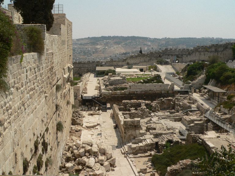 Der an jener Gihon-Quelle gelegene besiedelte Hügel ist klein, ca. 3 Hektar, und befindet sich heute südöstlich außerhalb der Jerusalemer Altstadt. Dass dieser Platz schon seit wenigstens der frühen Bronzezeit (32. – 23.Jh.v.Chr.) besiedelt war, zeigen Gräber und Keramikfunde, sowie die Überreste einer Stadtmauer aus dem 18.Jh.v.Chr.; einige Töpferfunde gehen zurück ins Chalkolithicum (ca. 4,5 JT. v.Chr. – 3,5 JT. v.Chr.). Nun war diese Siedlung natürlich eine von mehreren, die entlang jener Wasserscheide errichtet wurden. Diese so genannte „City of David“ erstreckt sich wie eine Zunge auf einem Hügel, der im Osten vom Kidron-Tal und im Westen vom Zentrums-Tal, oder Tyropoeon, das sich im Süden mit dem Hinnom-Tal trifft, begrenzt wird. Gegen Norden steigen, nur von einem schmalen Sattel (Ophel) begrenzt, die Berge an und machen eine Befestigung und Verteidigung schwierig – diese Seite bildete sicher für die Siedler eine Herausforderung und Gefahr und die Geschichte späterer Eroberungen zeigt, dass Angreifer häufig die Nordseite zur Überwindung der Stadtmauern nutzten. Die Siedlungsgeschichte Jerusalems hat noch offene Fragen, gerade was die Bauten aus der Zeit Davids und Salomos betrifft. Die Fachleute streiten darüber, ob sich Jerusalem in der Ersten Tempel-Periode über einen, oder zwei Hügel erstreckte – vergessen Sie im Übrigen, im heutigen Jerusalem eine Idee zu antiken Ausmaßen der Stadt zu bekommen, dazu ist alles zu viel bebaut und besiedelt, unmöglich ohne Modelle ein Idee des antiken Jerusalem zu erlangen. Einen gewissen Rahmen der antiken Ausdehnung zeigen uns die Grabfunde seit der Bronzezeit an. Diese befinden sich am Osthang des Kidron, westlich im Hinnom und nördlich des Damaskus-Tores. Weitere Gräber befinden sich innerhalb der heutigen Altstadt an Plätzen die außerhalb der alten Stadtmauern lagen. Es war im Übrigen das Privileg der Könige bis in die Zeit König Hiskias innerhalb der Stadt begraben zu werden. Wo diese Grabstätten sich befanden ist allerdings unbekannt; was heute als Grab Davids präsentiert wird, findet sich innerhalb eines Steinbruchs aus römischer Zeit (2. Jh.). Raimund Weill war Anfang des 20. Jahrhunderts im Auftrag Baron Rothschilds unterwegs, um in der David-Stadt nach den Gräbern der Könige zu suchen. Er war zwar erfolglos, aber erfindungsreich, denn er behauptete einfach, das von ihm gefundene Grab, das sich südlich des armenischen Viertel außerhalb der Altstadt am Mount Zion befindet, sei dasjenige von König David und einmal akzeptiert hält sich ein Mythos lange.