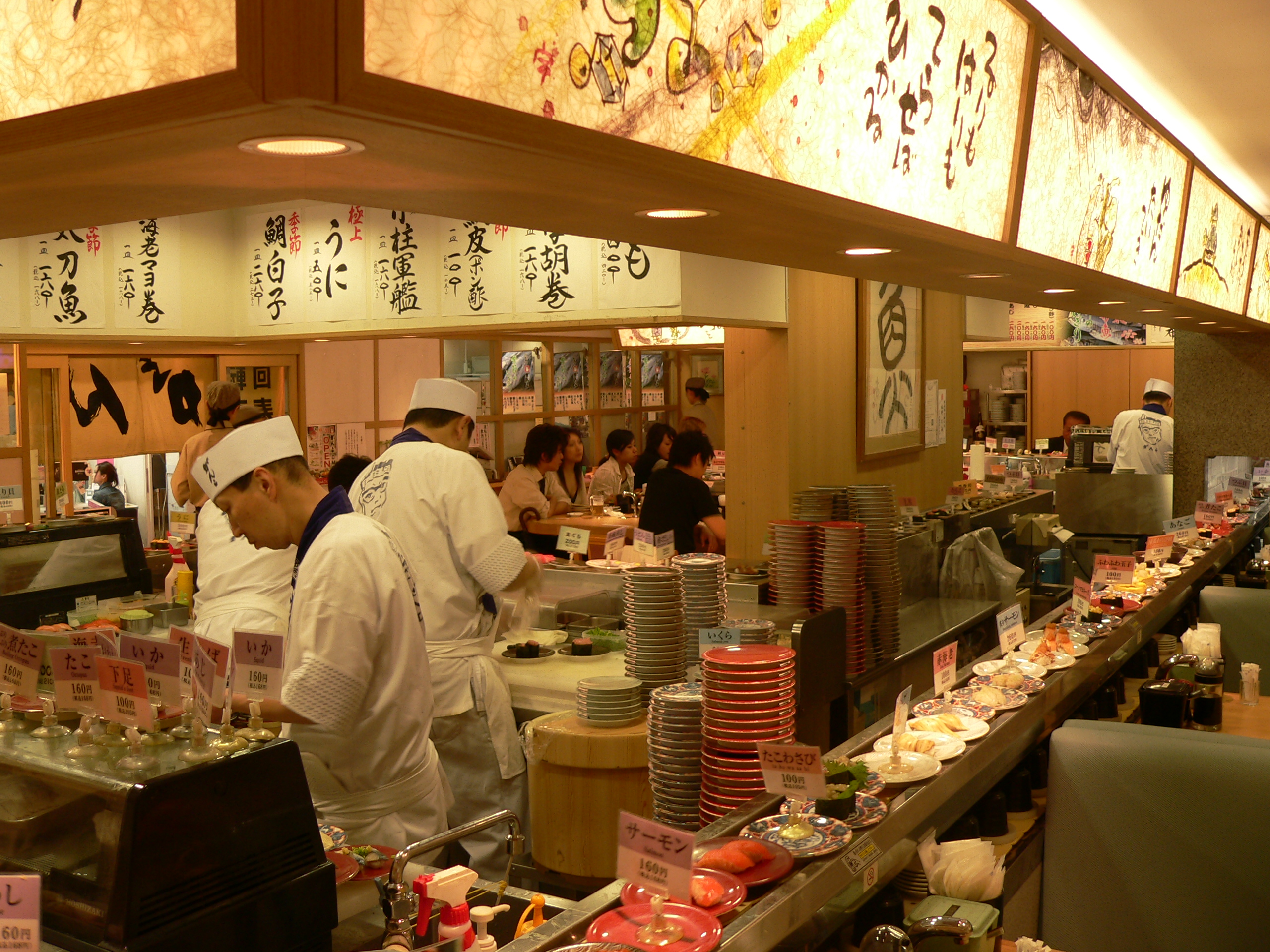 Convenience Stores, Konbini (meistverbreitete in JP: 7Eleven, FamilyMart, Lawson) bieten 24 Stunden nicht nur zahlreiche Dinge des täglichen Bedarfes, sondern auch Fertiggerichte, Essenszutaten, Gewürze, Gemüse, große Getränkeauswahl und essensfertige Bento-Boxen, mit denen sich Angestellte in ihren knappen Pausen oder Reisende leicht und preiswert verköstigen. Bei Übernachtungen in Ryokan (旅館, traditionelle Gästehäuser) werden exzellente Gerichte gewöhnlich im Haus serviert. Für Besuche in hochwertigeren Restaurants sollte gebucht oder wenigstens angerufen werden. So schnell wie bequem sind Kaitenzushi (回転寿司), in denen sich der Gast von den auf Band vorbeilaufenden Portionen bedienen kann, doch besonders populär sind japanische Kneipen namens Izakaya (居酒屋) für Zusammenkünfte zu Speis und Trank, zumeist mit einer guten Auswahl lokaler Köstlichkeiten. In traditionellen, älteren Izakaya gibt es häufig nicht allein TV-Unterhaltung, sondern einige dieser Nachbarschaftskneipen haben sogar Karaokeanlage, falls ein paar Gäste abends ihrer Sangeslust Stimme verleihen wollen. Trinkgeld ist in JP generell tabu, doch wird gewöhnlich in solchen Kneipen zu Anfang unaufgefordert und unkommentiert eine für jeden Gast vorbereitete, kleinere Portion serviert (o-tōshi お通し), die zusätzlich auf der Rechnung steht, quasi als Extra-Obulus fürs Haus, und der jeweilige Chef hinterm Tresen, da ist der unterhaltsamste Platz, freut sich jederzeit über spendierte Getränke vom Gast. Üblich ist es auch, wenn die Stammgäste dort eine Flasche Shōchū (焼酎, eine Art Branntwein, wird häufig vermischt mit Eis/Wasser o.ä. getrunken) ihrer Wahl erwerben, die dann Abend für Abend mit ihrem Namensschild versehen mit den beschilderten Flaschen anderer Gäste auf ihre Wiederkehr wartet, bis sie geleert ist und eine neue Flasche die Reihe fortsetzt.